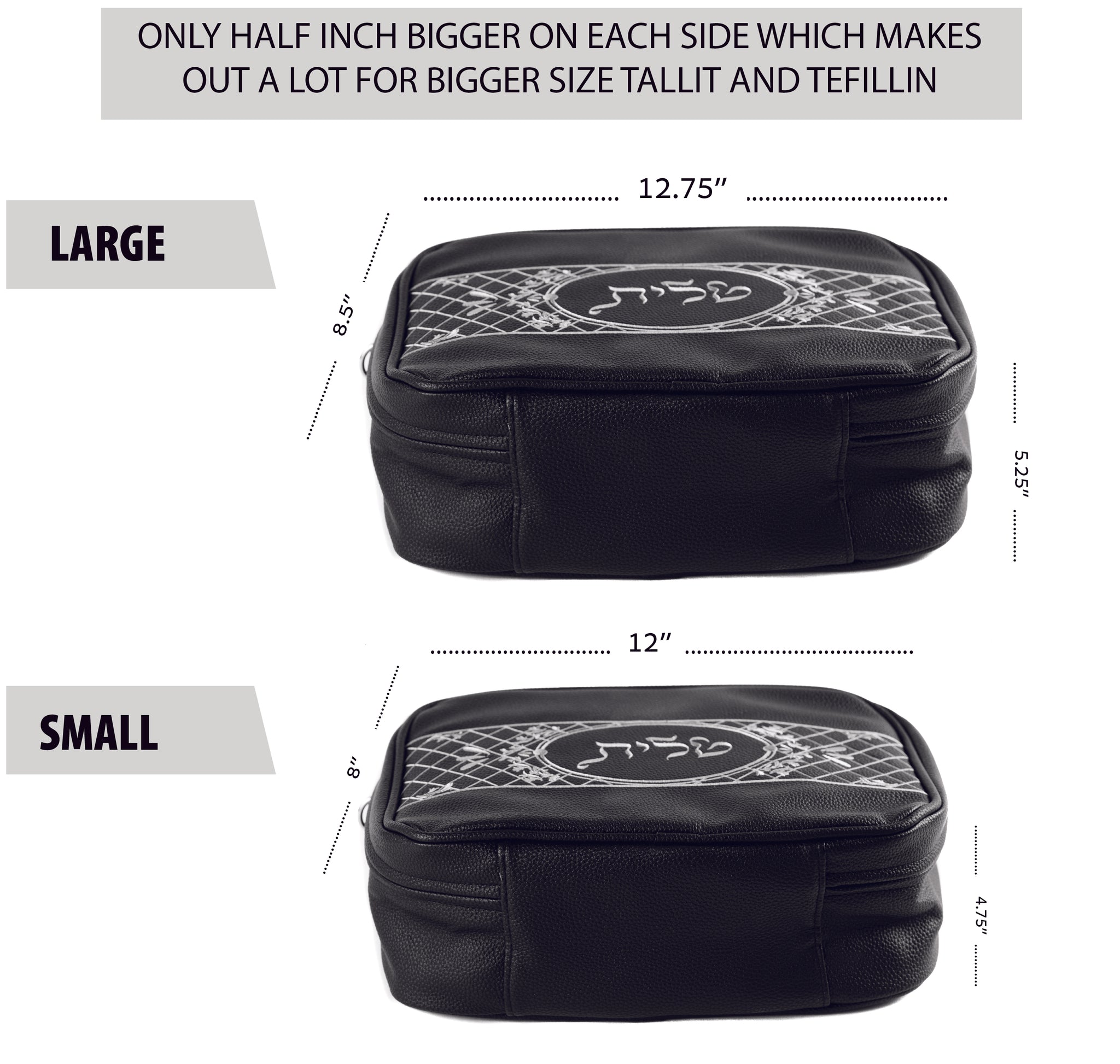 - fits even two pairs of tefillin and talis sider gartel the difference between the two sizes is a half inch on each side with makes out a lot for a bigger tallit and tefillin מתאים גם שני זוגות תפילין וטלית סידור גרטל